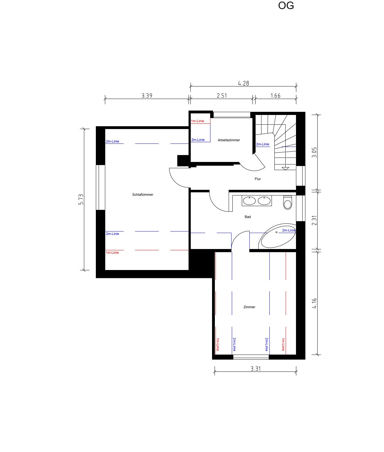 Das Obergeschoss ist mit einem kleinen Arbeitszimmer, einem größeren Schlafzimmer sowie einem etwas versteckt liegenden weiterem Zimmer hinter dem Badezimmer ausgestattet.