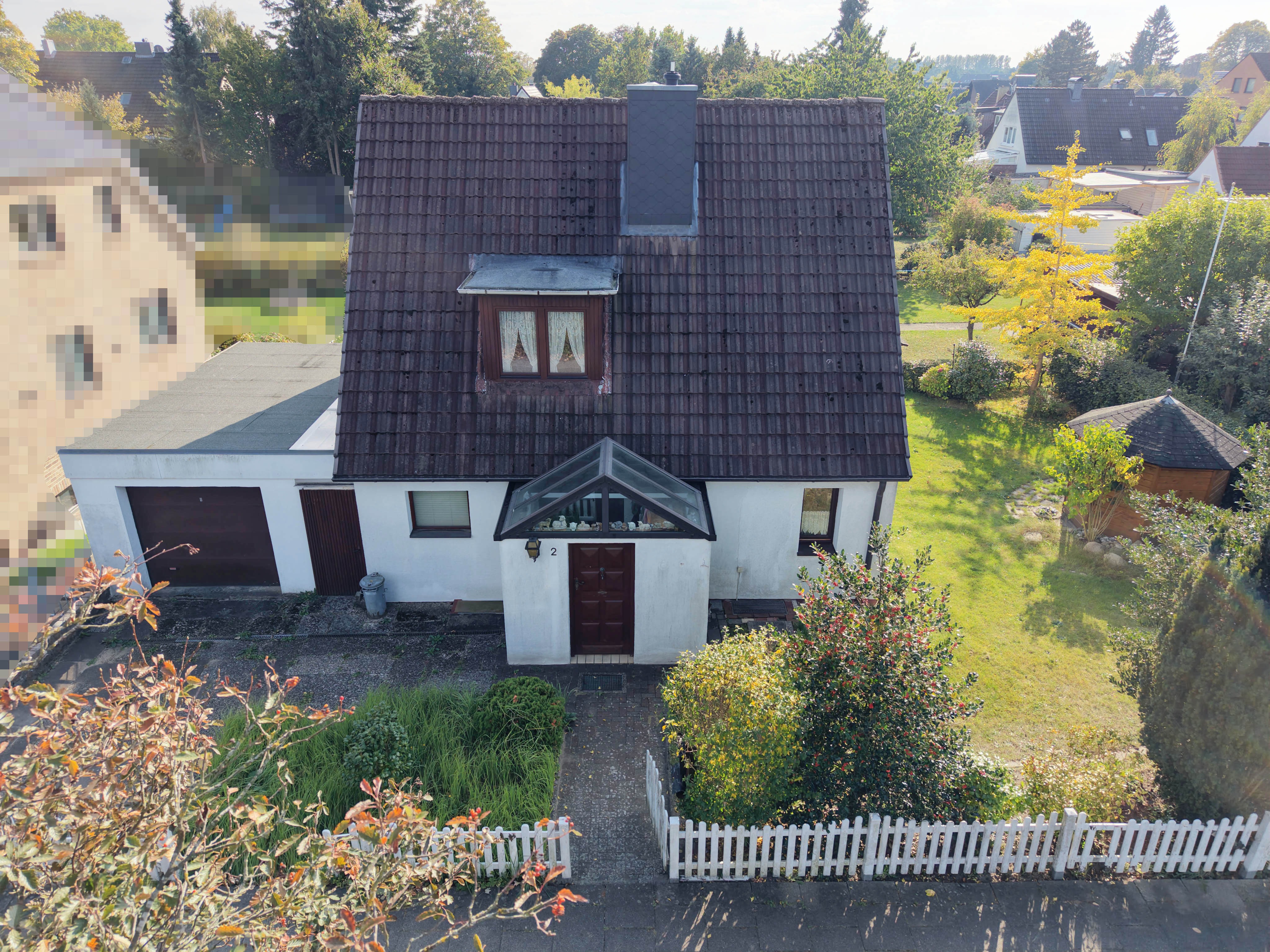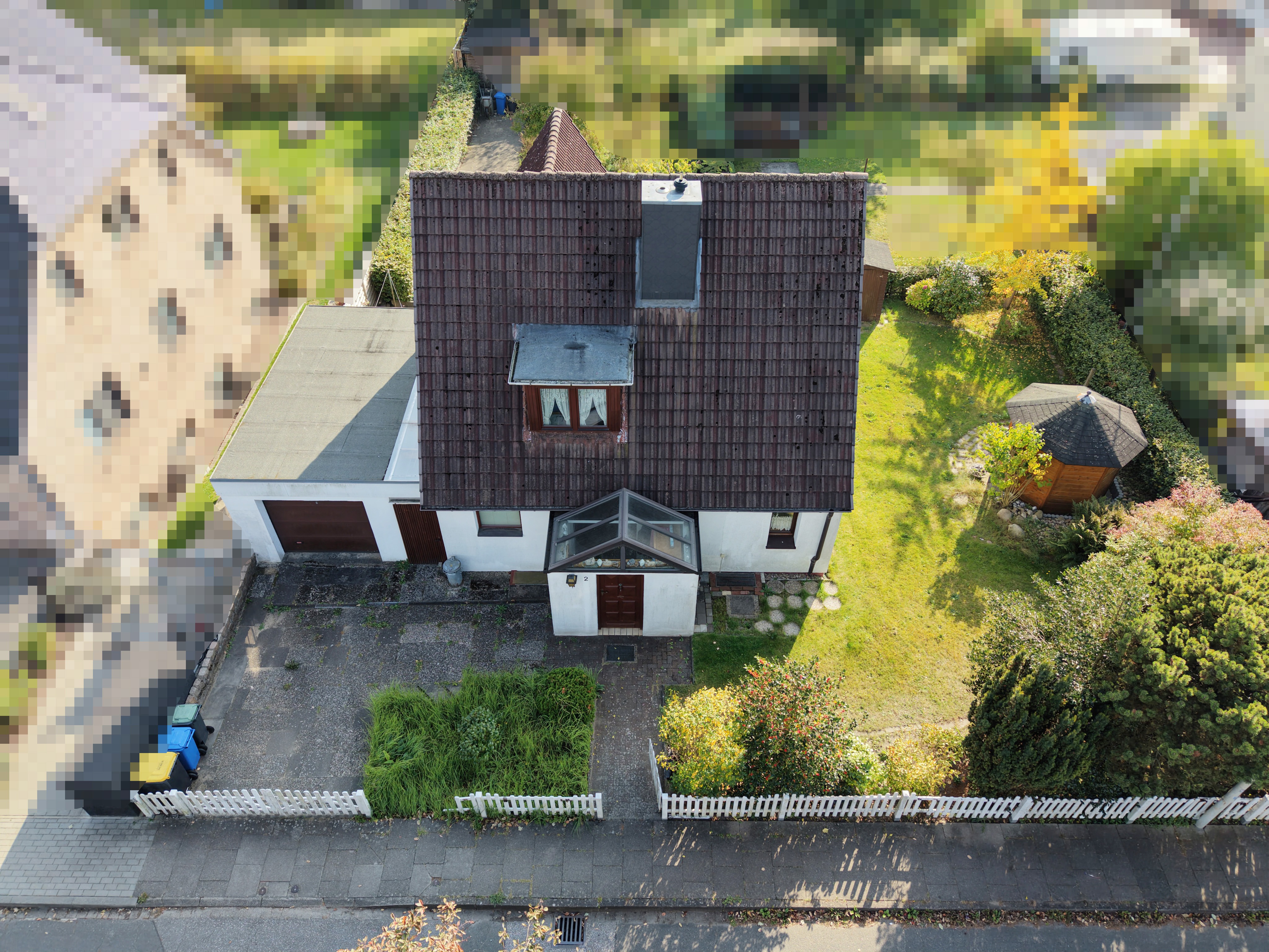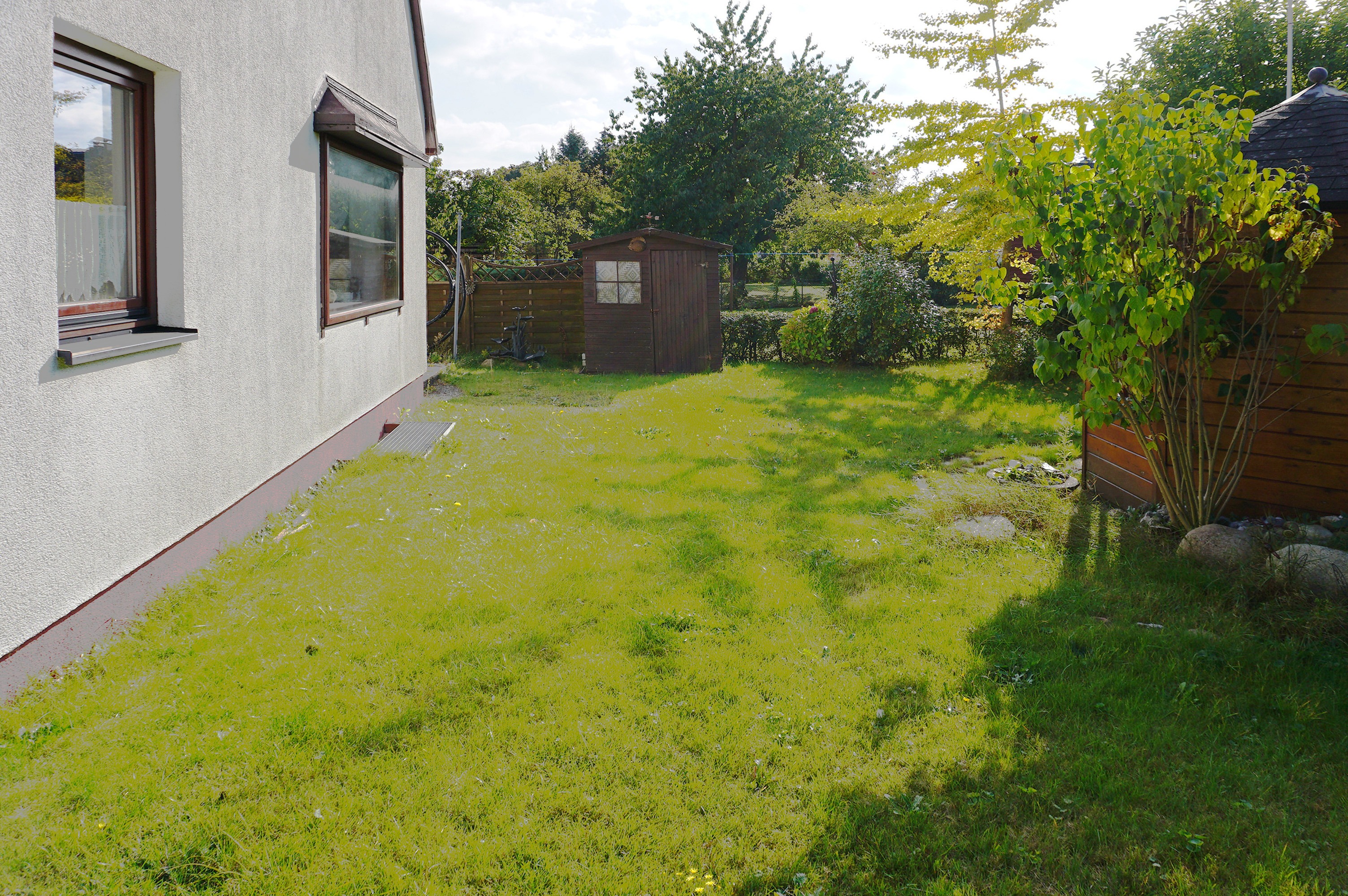 Der Garten ist pflegeleicht und bietet einen Pavillon bzw. ein Gartenhaus, Hier können Sie sich in ruhiger Lage einen schönen Ort zum Entspannen errichten.